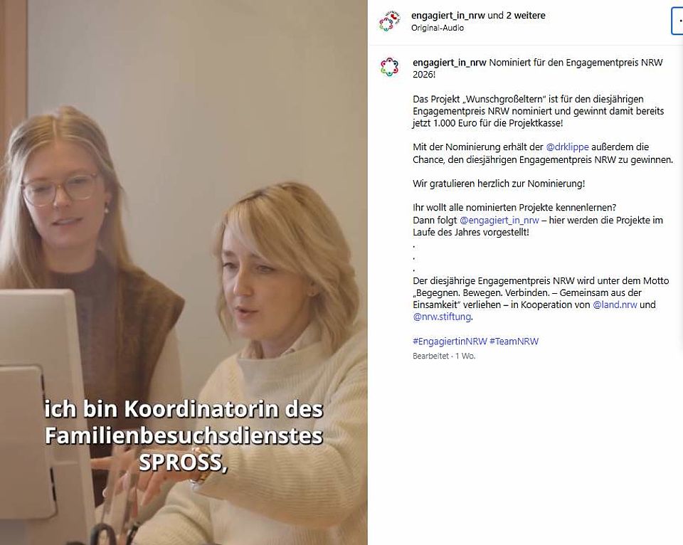 Mit zahlreichen Projekten haben sich Vereine, Initiativen, Verbände und Stiftungen, gGmbHs sowie öffentliche Einrichtungen aus Nordrhein-Westfalen bis zum Einsendeschluss Ende September 2025 beworben. Jeden Monat wird ein nominiertes Projekt vorgestellt. Im April sind nun die „Wunschgroßeltern" an der Reihe - ein Projekt von SPROSS (Service ProStärkung und Schutz), einer Kooperation der DRK-Jugendhilfe und Familienförderung in Lippe und dem Kreis Lippe.