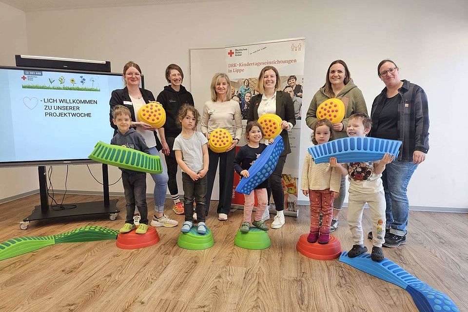 „Die Kinder können anhand von verschiedenen Aufgabenstellungen ihre Konzentrationsfähigkeit üben, das ist ein zentrales Ziel der Workshops“, erläutert Reinhard Stükerjürgen. Zum Wochenauftakt unter dem Motto Bewegung und Koordination wird zunächst die Bedeutung von Bewegung für die verschiedenen Bildungsbereiche betont. „Das Denken in alle Richtungen, in die Zukunft und die Vergangenheit gerichtet, aber auch schon beim Plus- und Minus-Rechnen, funktioniert wesentlich besser, wenn wir auch geübt haben, den Körper in alle Richtungen zu bewegen“, erläutert Nina Marhofen, die den ersten Workshop durchführt. Auch Martina Grün, Kita-Fachberaterin bei der DRK-Jugendhilfe und Familienförderung in Lippe, ist begeistert: „Kinder erforschen ihre Welt aktiv, und gerade dieses aktive Experimentieren, das in den Workshops ermöglicht wird, spricht alle Altersgruppen an, das beginnt schon bei den U3-Kindern.“